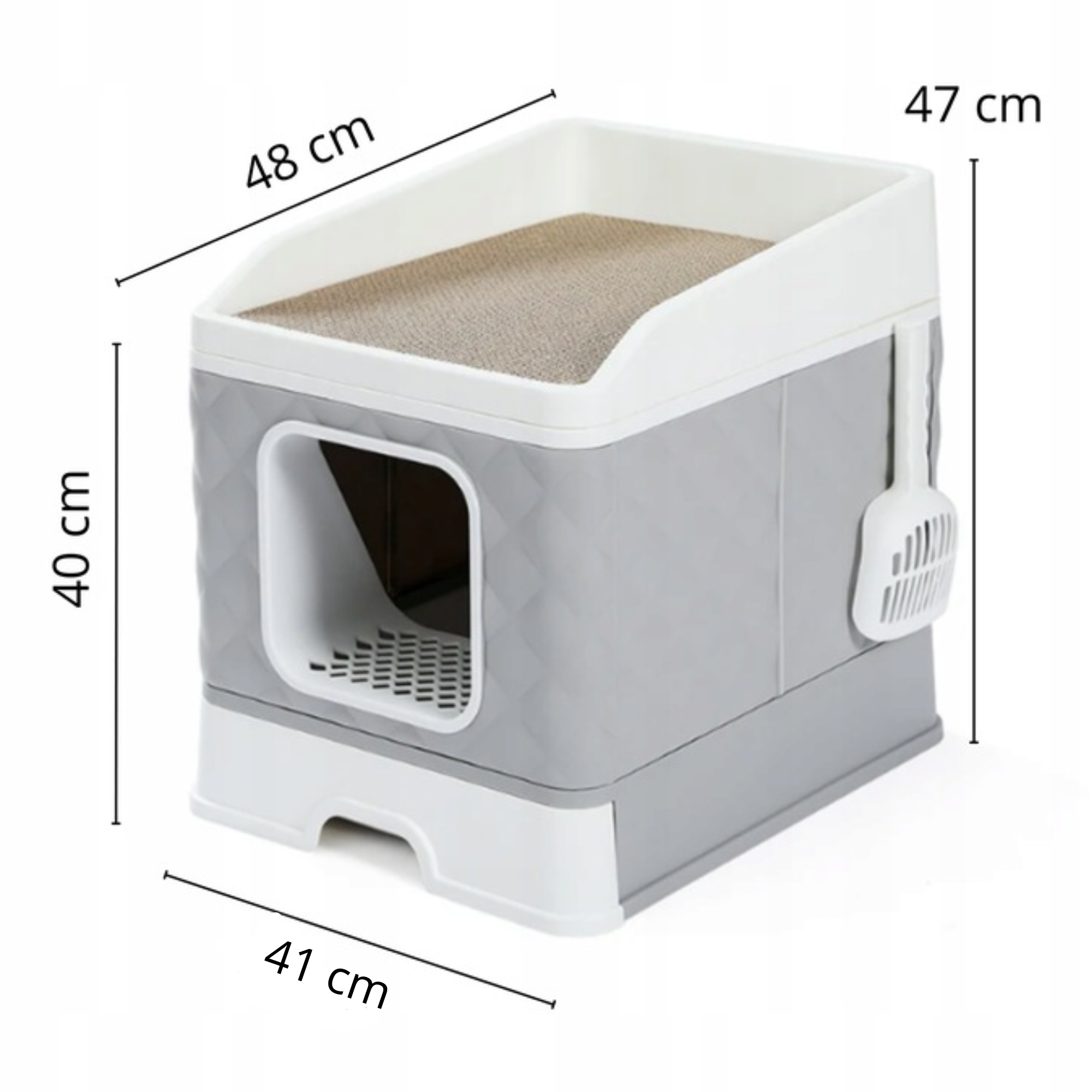 ⭐ ДРЯПКА - верхня частина лотка, якою можна закрити один із виходів, має матеріал, який можна використовувати як дряпку для кота,